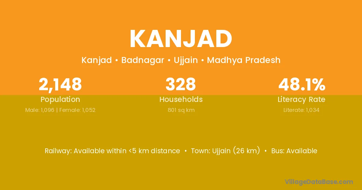 Ujjain (26 km) is the nearest town to Kanjad village for major economic activities and is located approximately 26 km away.