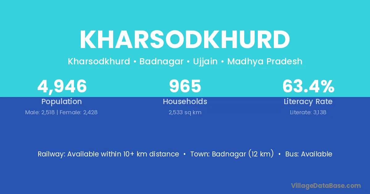 Badnagar (12 km) is the nearest town to Kharsodkhurd village for major economic activities and is located approximately 12 km away.