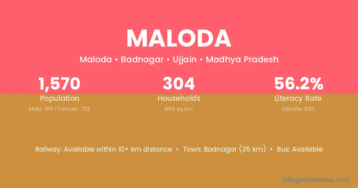 Badnagar (35 km) is the nearest town to Maloda village for major economic activities and is located approximately 35 km away.