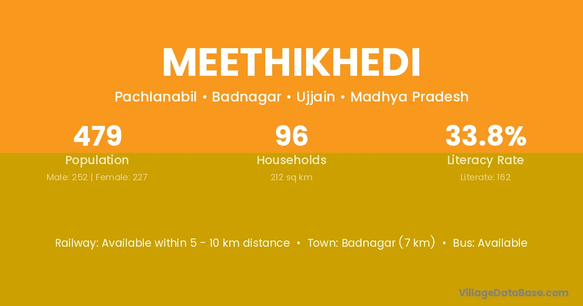 Badnagar (7 km) is the nearest town to Meethikhedi village for major economic activities and is located approximately 7 km away.