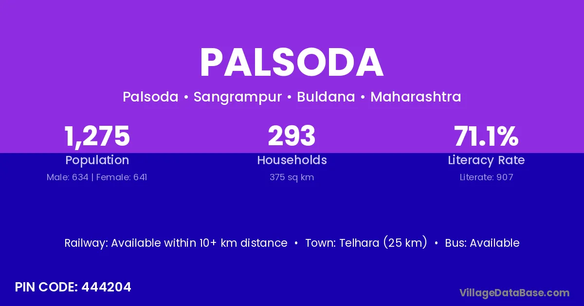 The literacy rate of Palsoda village is 51.09%. Male literacy stands at 66.29% and female literacy at 36.49%.