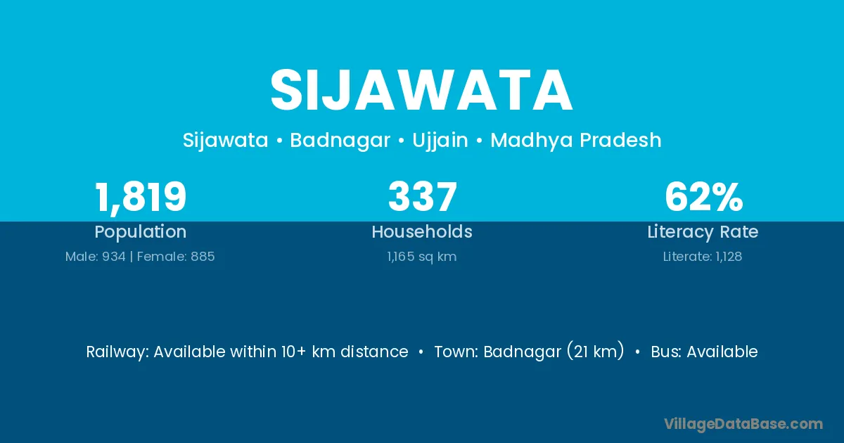Badnagar (21 km) is the nearest town to Sijawata village for major economic activities and is located approximately 21 km away.