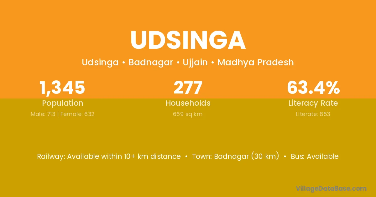 Badnagar (30 km) is the nearest town to Udsinga village for major economic activities and is located approximately 30 km away.