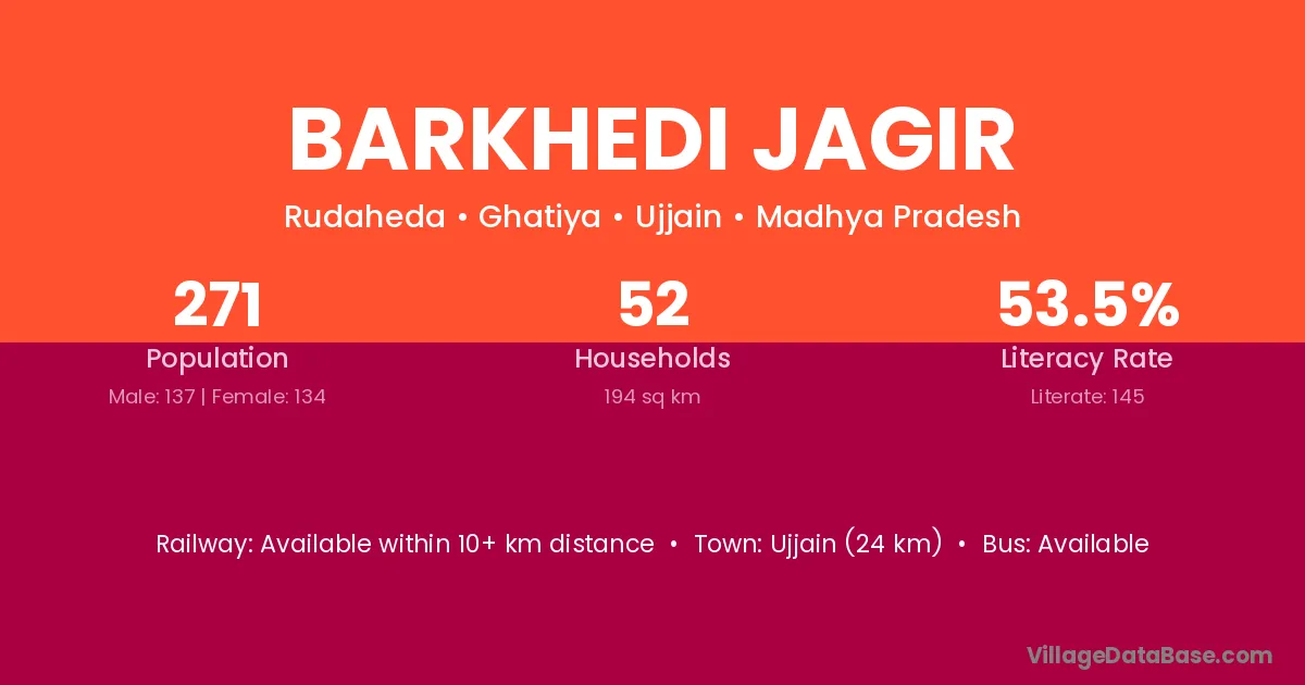 Barkhedi Jagir village has a total population of 271 people, of which 137 are males and 134 are females.