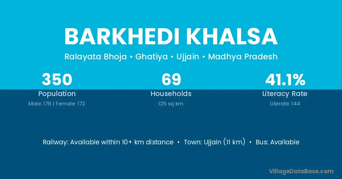 Ujjain (11 km) is the nearest town to Barkhedi Khalsa village for major economic activities and is located approximately 11 km away.
