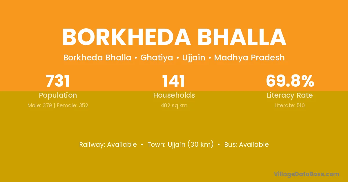 Borkheda Bhalla village has a total population of 731 people, of which 379 are males and 352 are females.