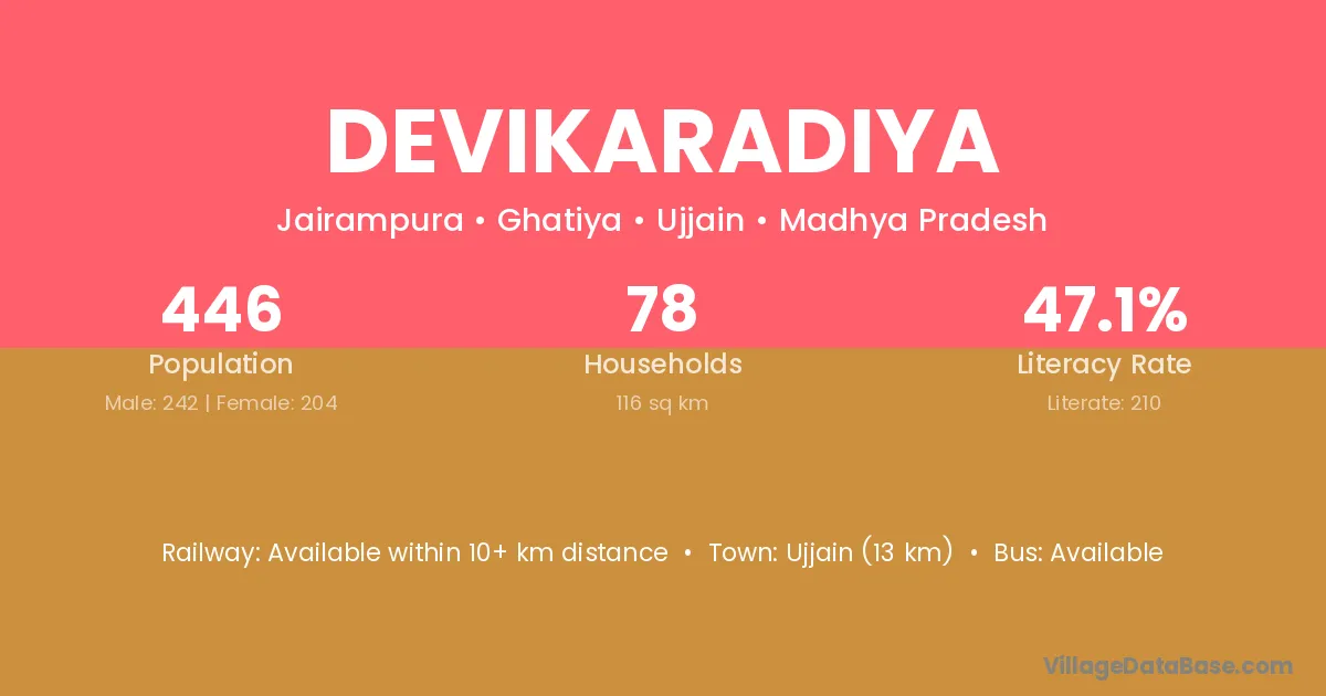 Ujjain (13 km) is the nearest town to Devikaradiya village for major economic activities and is located approximately 13 km away.