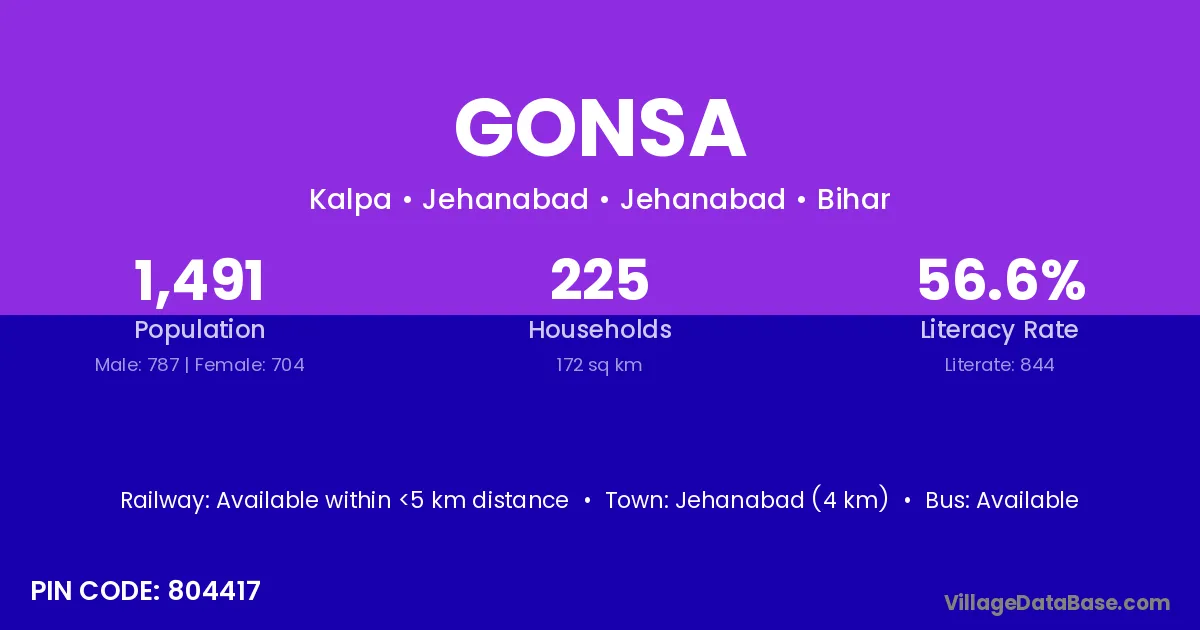 Gonsa village has a total population of 1,498 people, of which 787 are males and 711 are females.