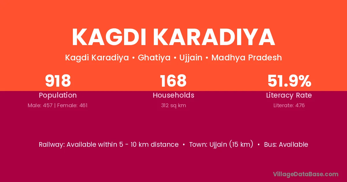 Ujjain (15 km) is the nearest town to Kagdi Karadiya village for major economic activities and is located approximately 15 km away.