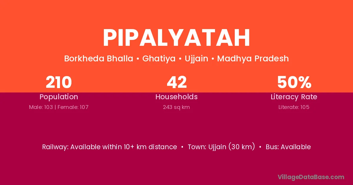 Ujjain (30 km) is the nearest town to Pipalyatah village for major economic activities and is located approximately 30 km away.