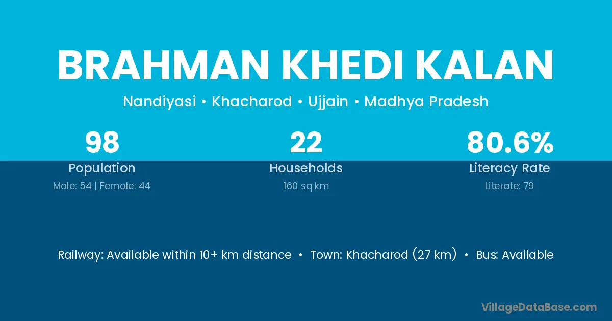 Khacharod (27 km) is the nearest town to Brahman Khedi Kalan village for major economic activities and is located approximately 27 km away.