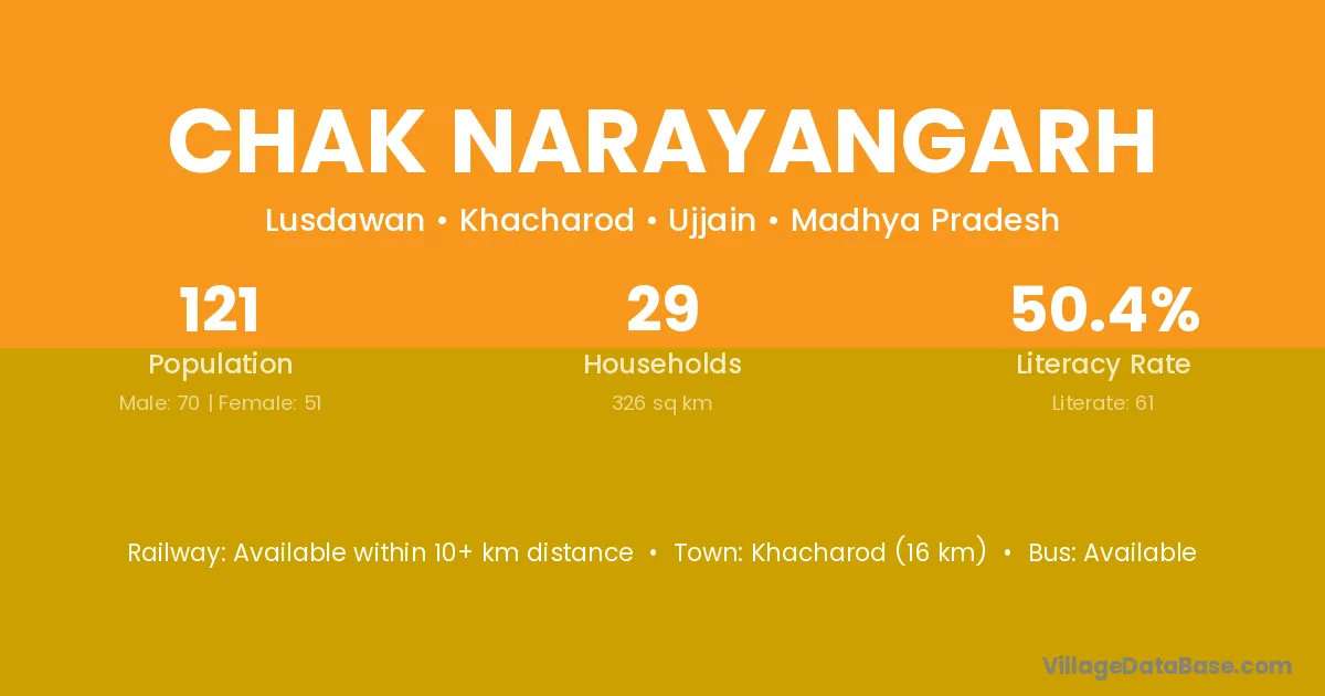 Chak Narayangarh village has a total population of 121 people, of which 70 are males and 51 are females.