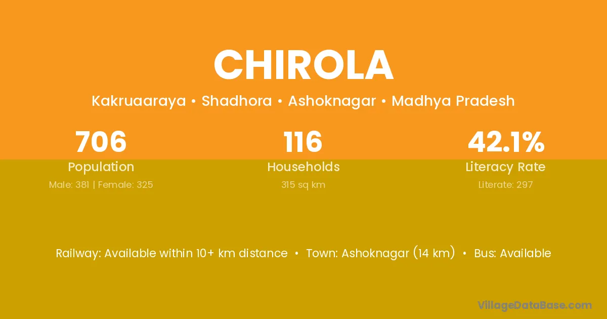 The literacy rate of Chirola village is 58.79%. Male literacy stands at 72.97% and female literacy at 43.78%.