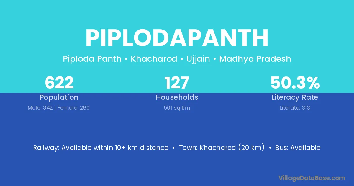 Khacharod (20 km) is the nearest town to Piplodapanth village for major economic activities and is located approximately 20 km away.