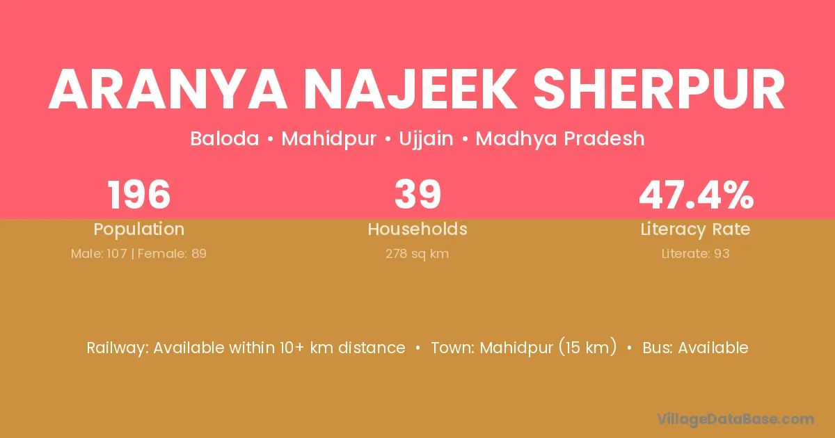 Mahidpur (15 km) is the nearest town to Aranya Najeek Sherpur village for major economic activities and is located approximately 15 km away.