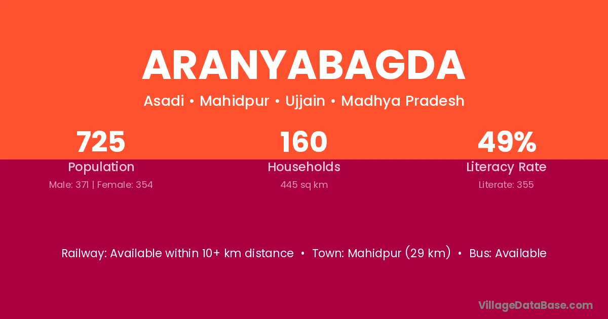 Mahidpur (29 km) is the nearest town to Aranyabagda village for major economic activities and is located approximately 29 km away.