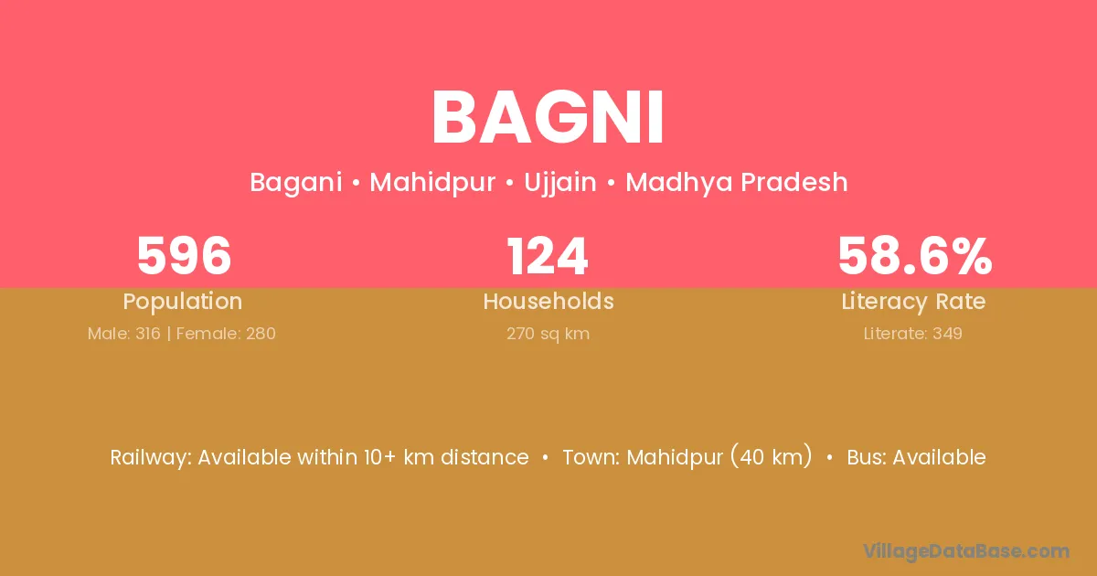 Mahidpur (40 km) is the nearest town to Bagni village for major economic activities and is located approximately 40 km away.