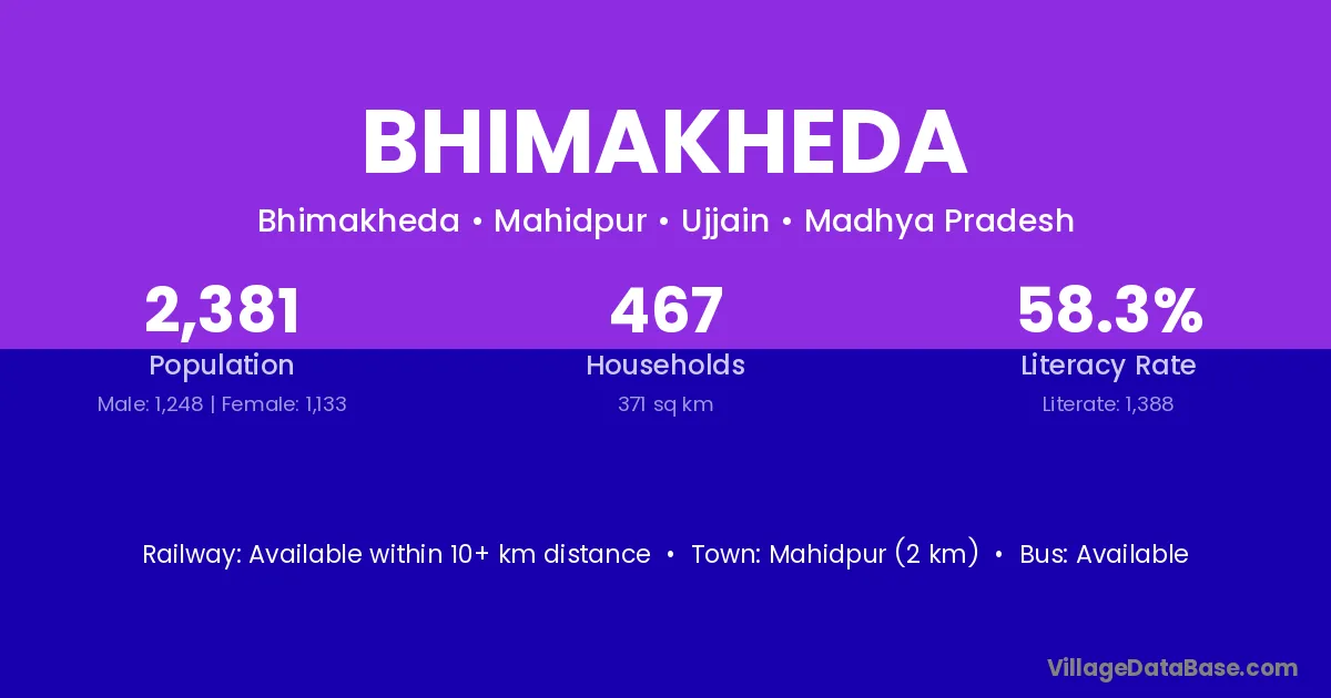 Mahidpur (2 km) is the nearest town to Bhimakheda village for major economic activities and is located approximately 2 km away.