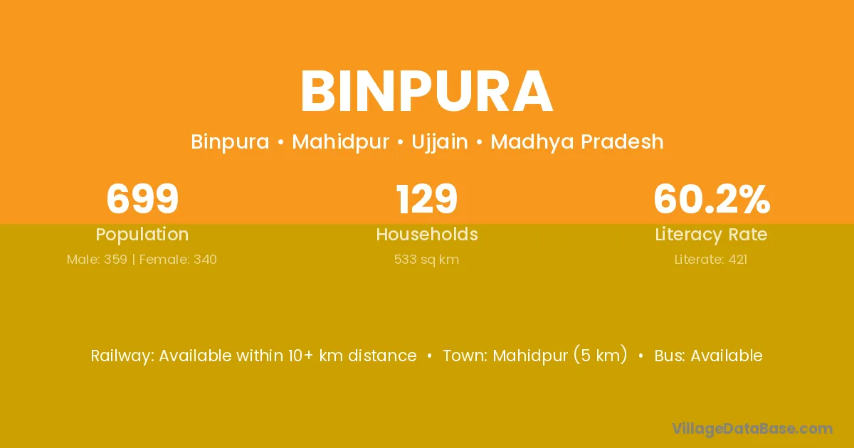 Mahidpur (5 km) is the nearest town to Binpura village for major economic activities and is located approximately 5 km away.