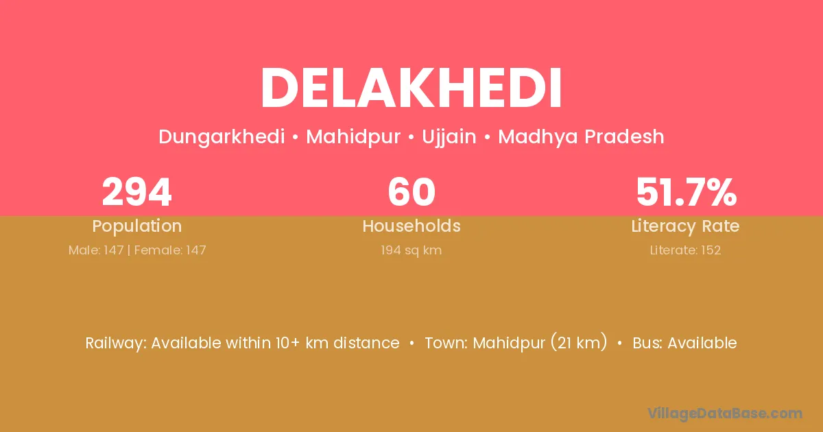 Mahidpur (21 km) is the nearest town to Delakhedi village for major economic activities and is located approximately 21 km away.