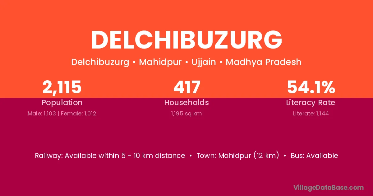 Mahidpur (12 km) is the nearest town to Delchibuzurg village for major economic activities and is located approximately 12 km away.