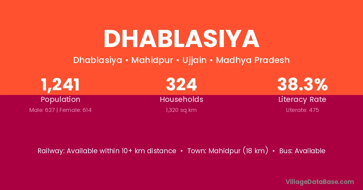 Mahidpur (18 km) is the nearest town to Dhablasiya village for major economic activities and is located approximately 18 km away.