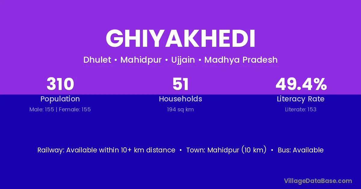 Ghiyakhedi village has a total population of 310 people, of which 155 are males and 155 are females.