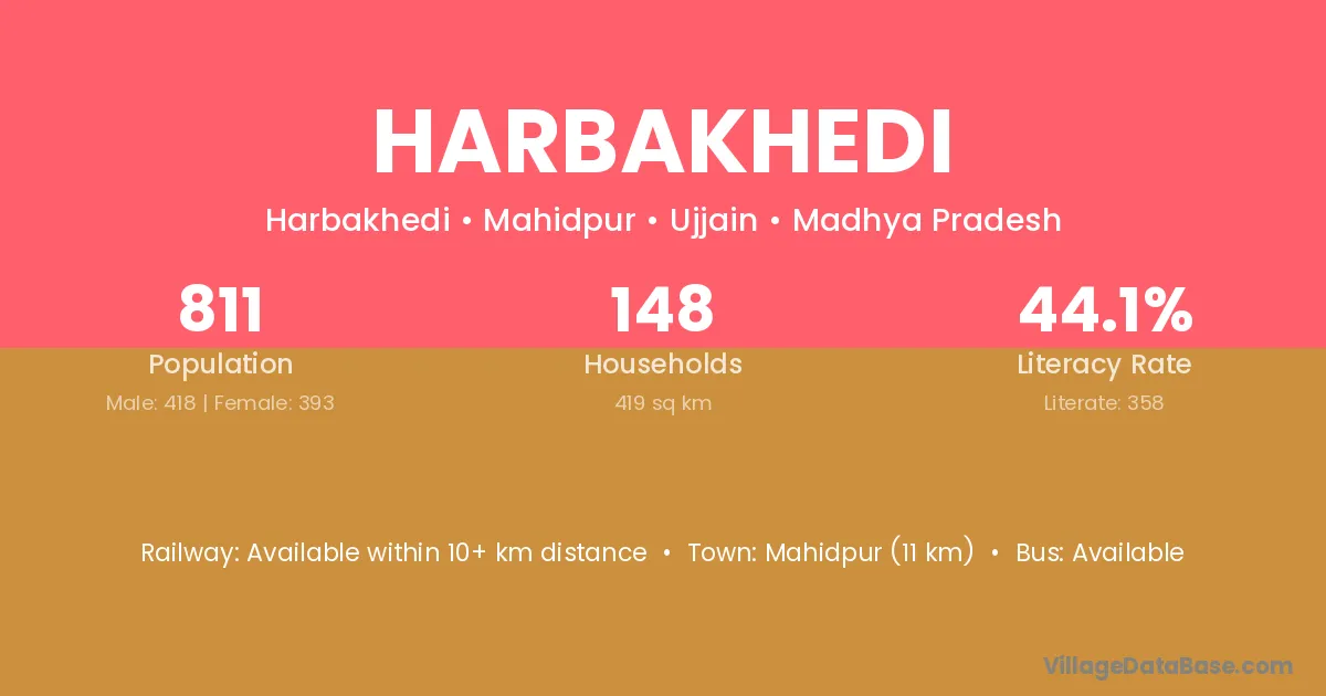 Mahidpur (11 km) is the nearest town to Harbakhedi village for major economic activities and is located approximately 11 km away.