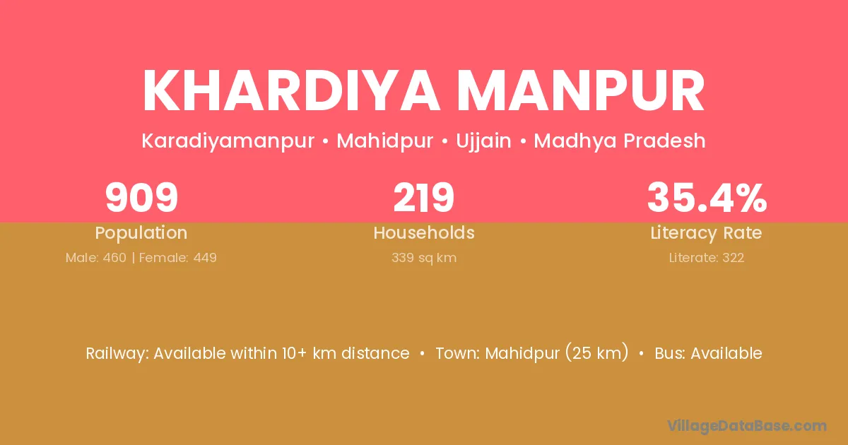 Mahidpur (25 km) is the nearest town to Khardiya Manpur village for major economic activities and is located approximately 25 km away.