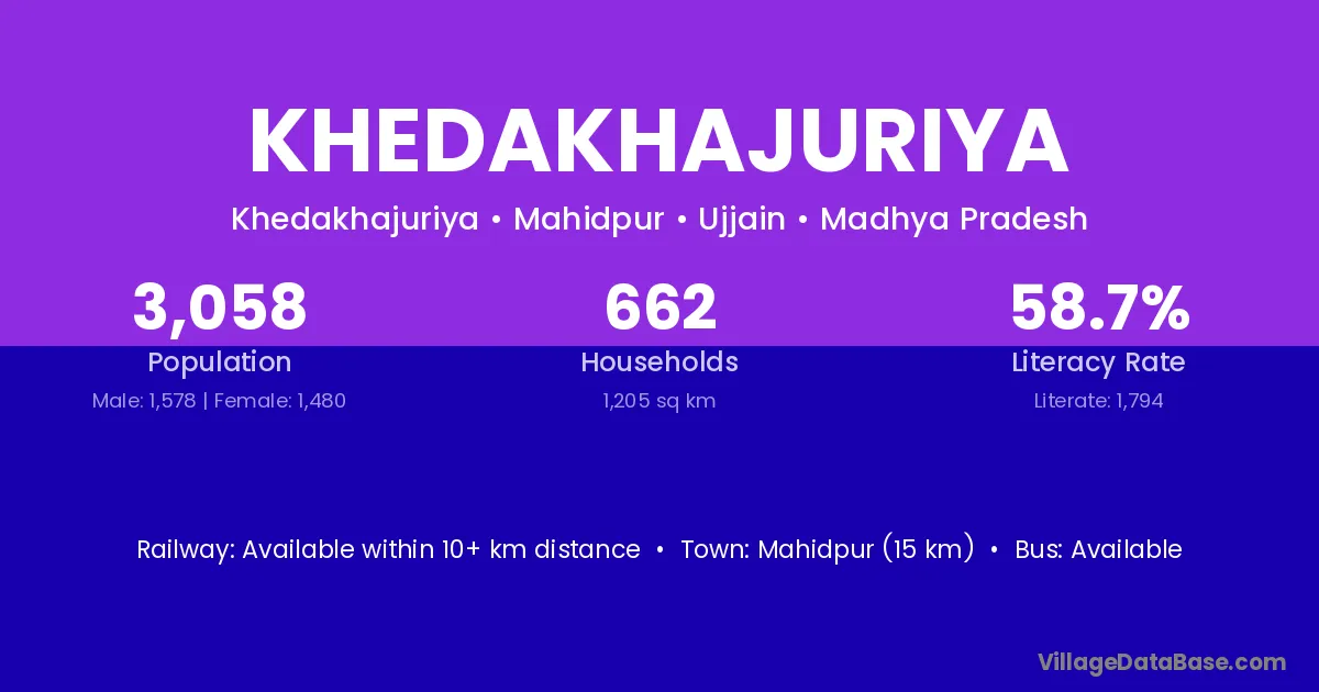 Mahidpur (15 km) is the nearest town to Khedakhajuriya village for major economic activities and is located approximately 15 km away.