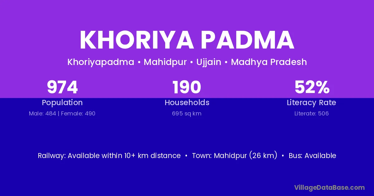 Mahidpur (26 km) is the nearest town to Khoriya Padma village for major economic activities and is located approximately 26 km away.