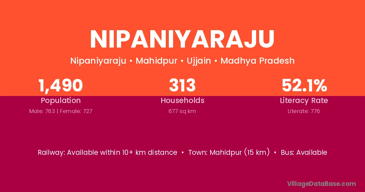 Mahidpur (15 km) is the nearest town to Nipaniyaraju village for major economic activities and is located approximately 15 km away.