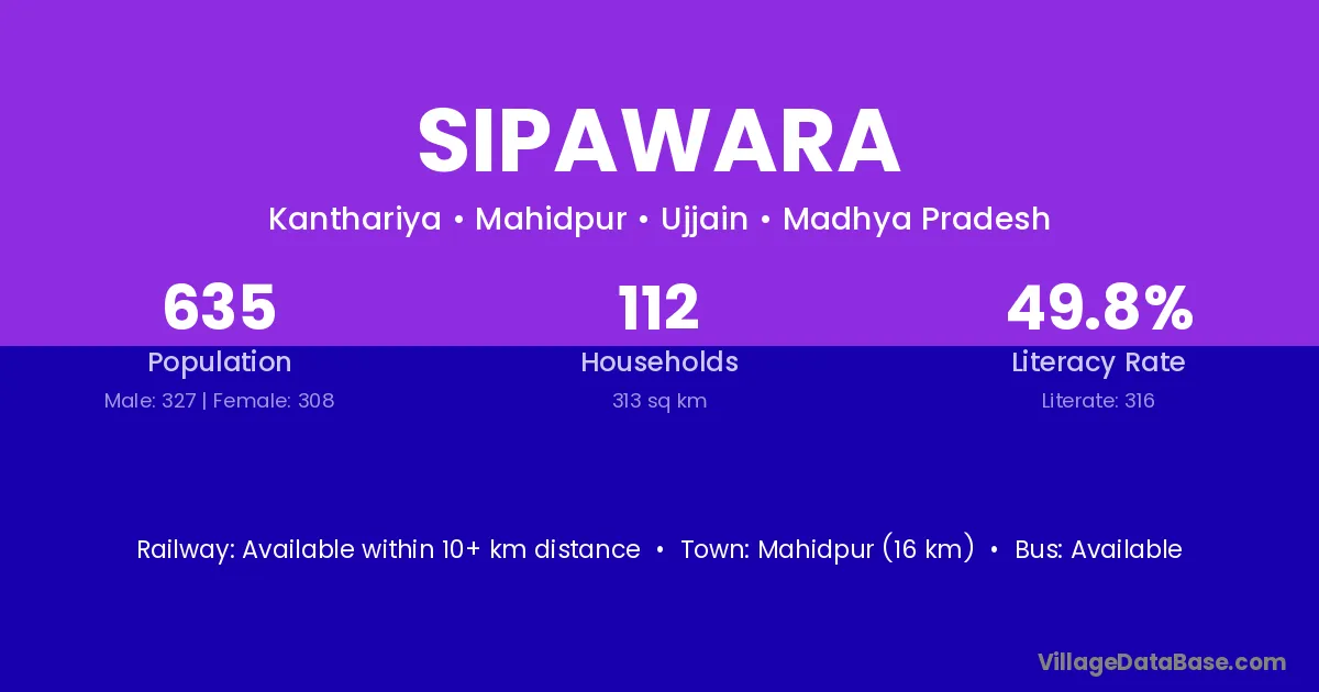 Mahidpur (16 km) is the nearest town to Sipawara village for major economic activities and is located approximately 16 km away.