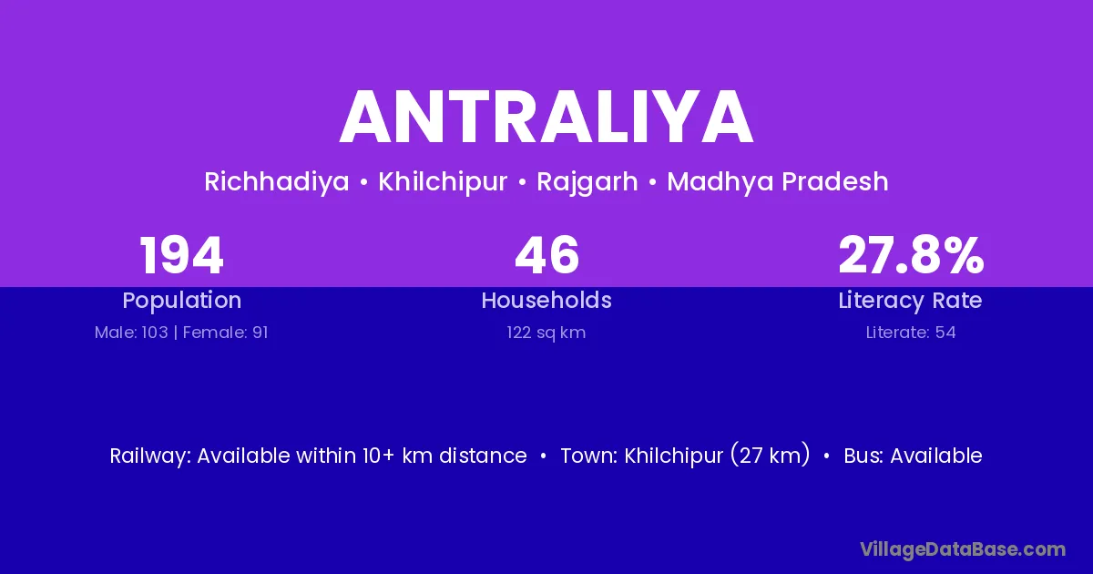The literacy rate of Antraliya village is 49.77%. Male literacy stands at 69.98% and female literacy at 30.20%.