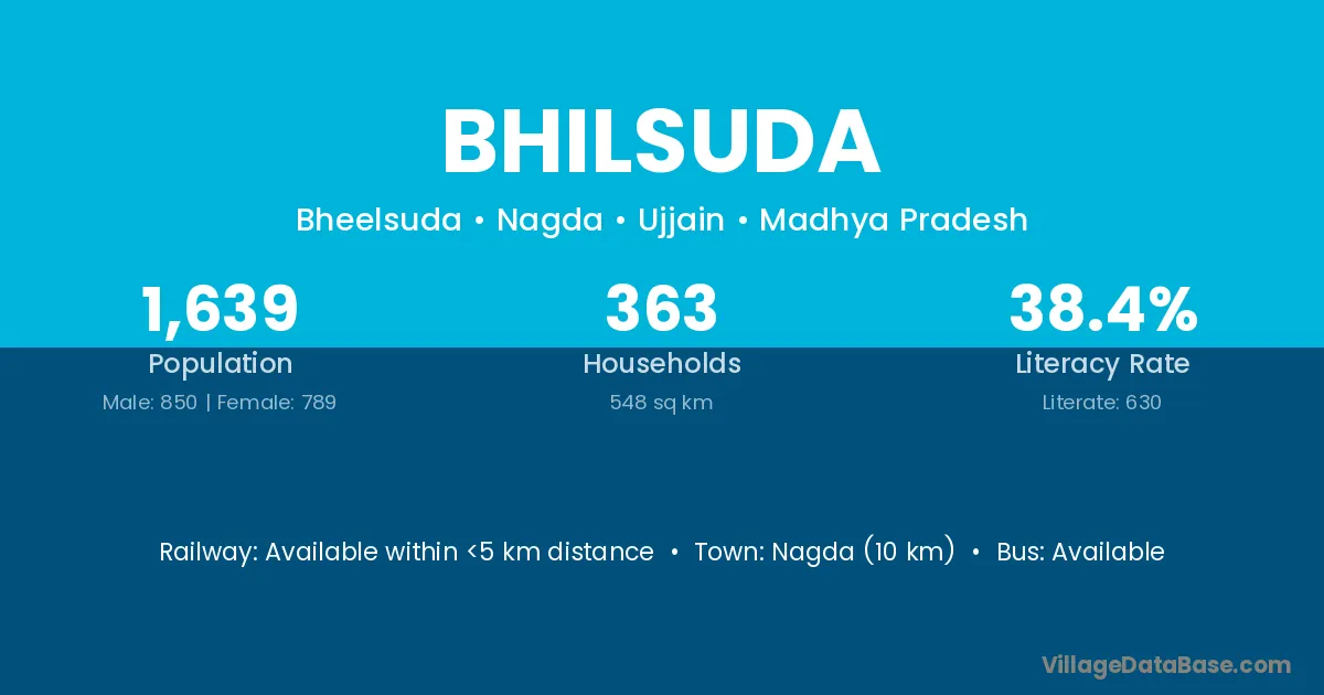 Nagda (10 km) is the nearest town to Bhilsuda village for major economic activities and is located approximately 10 km away.