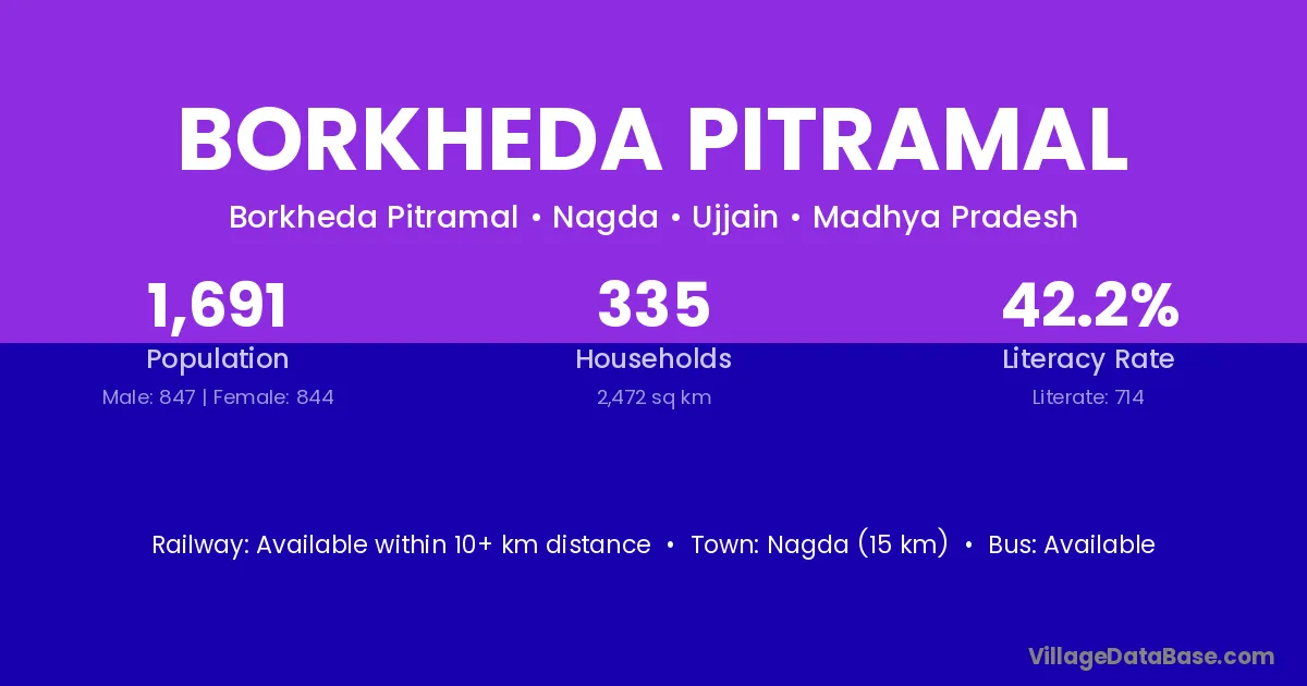 Borkheda Pitramal village has a total population of 1,691 people, of which 847 are males and 844 are females.