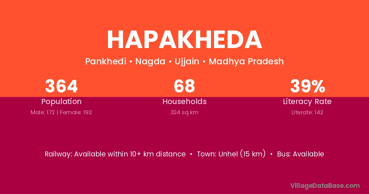 Hapakheda village has a total population of 364 people, of which 172 are males and 192 are females.