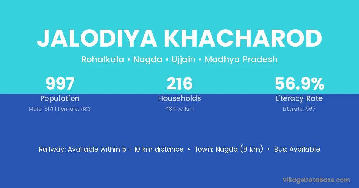 Jalodiya Khacharod village has a total population of 997 people, of which 514 are males and 483 are females.