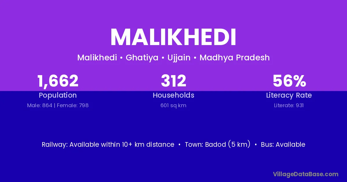 Malikhedi village has a total population of 1,885 people, of which 989 are males and 896 are females.