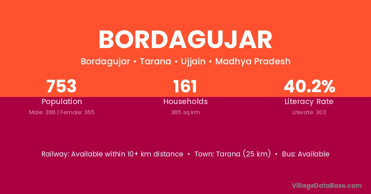 Tarana (25 km) is the nearest town to Bordagujar village for major economic activities and is located approximately 25 km away.