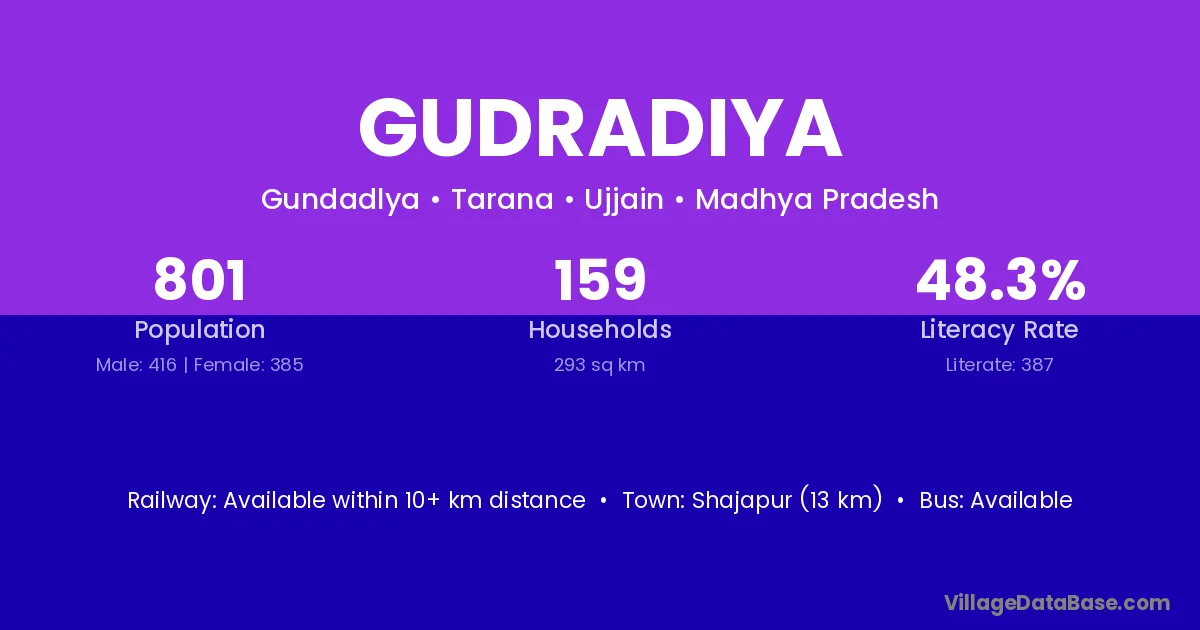 Shajapur (13 km) is the nearest town to Gudradiya village for major economic activities and is located approximately 13 km away.