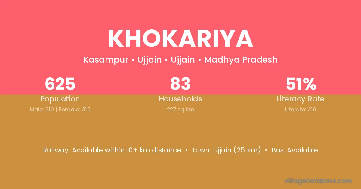 Khokariya village has a total population of 715 people, of which 365 are males and 350 are females.