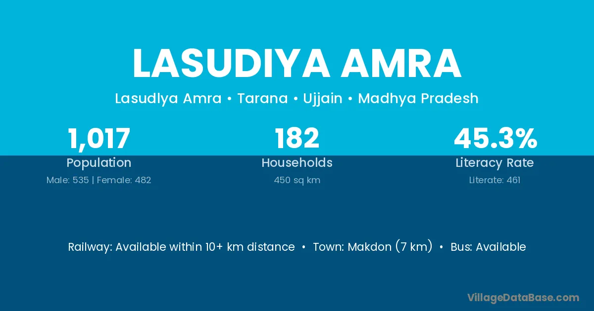 Lasudiya Amra village has a total population of 1,017 people, of which 535 are males and 482 are females.