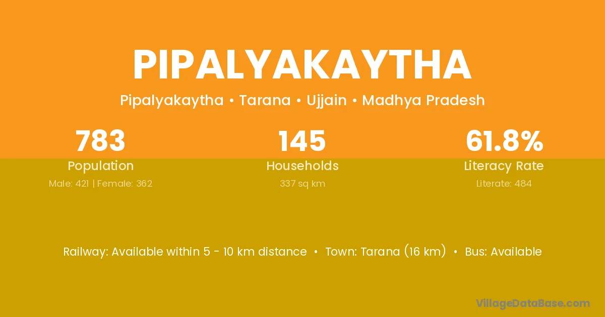 Tarana (16 km) is the nearest town to Pipalyakaytha village for major economic activities and is located approximately 16 km away.