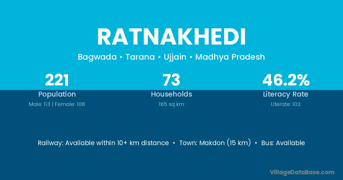 Ratnakhedi village has a total population of 221 people, of which 113 are males and 108 are females.