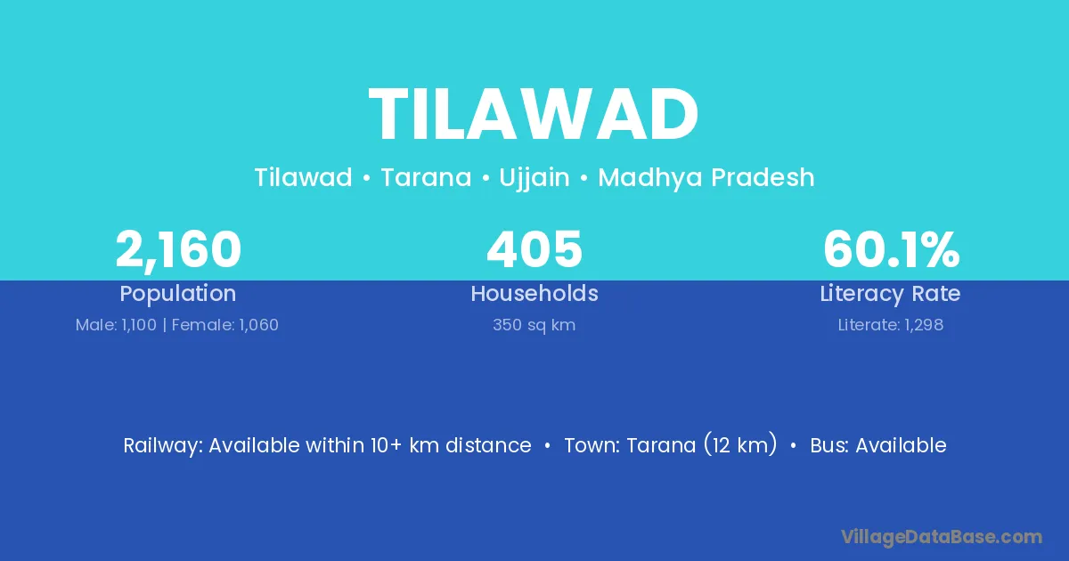 Tarana (12 km) is the nearest town to Tilawad village for major economic activities and is located approximately 12 km away.