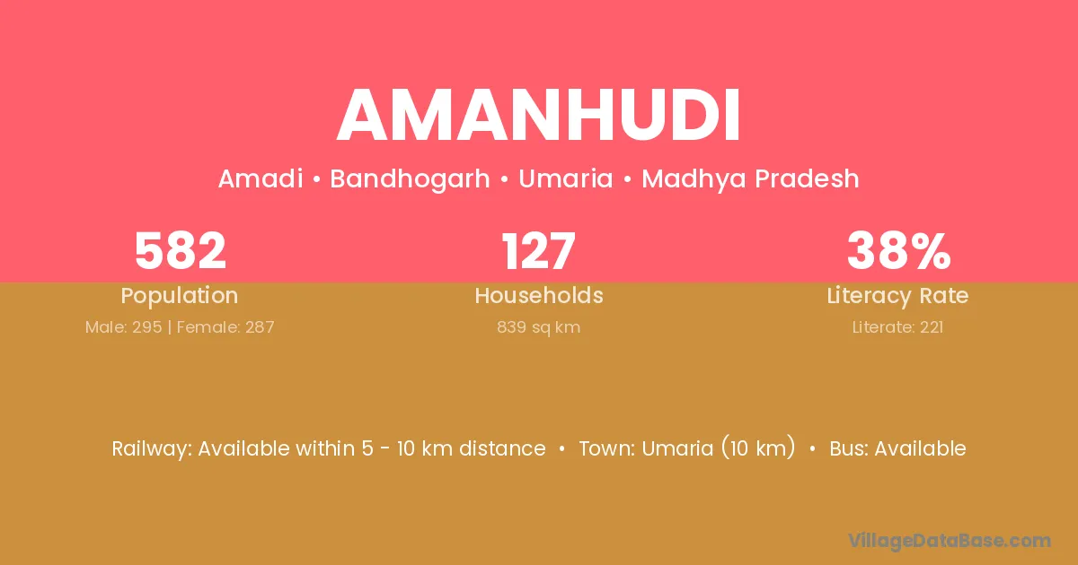 Umaria (10 km) is the nearest town to Amanhudi village for major economic activities and is located approximately 10 km away.