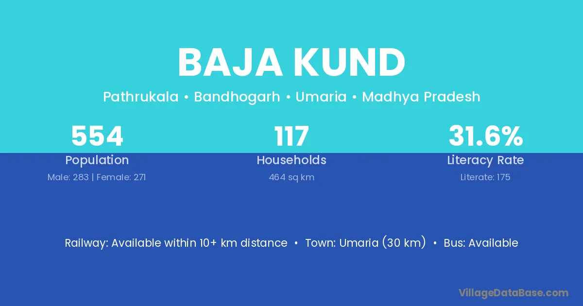 Umaria (30 km) is the nearest town to Baja Kund village for major economic activities and is located approximately 30 km away.