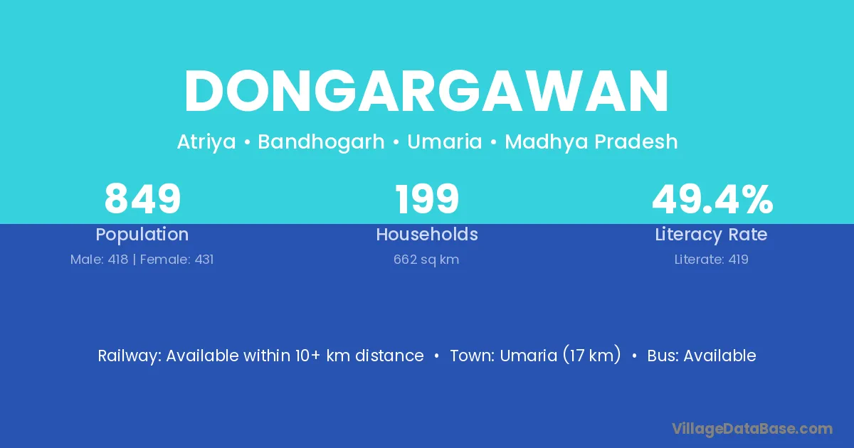 Dongargawan village has a total population of 849 people, of which 418 are males and 431 are females.