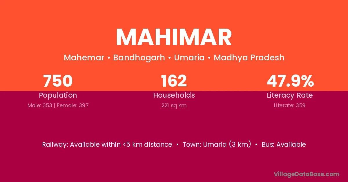 Umaria (3 km) is the nearest town to Mahimar village for major economic activities and is located approximately 3 km away.